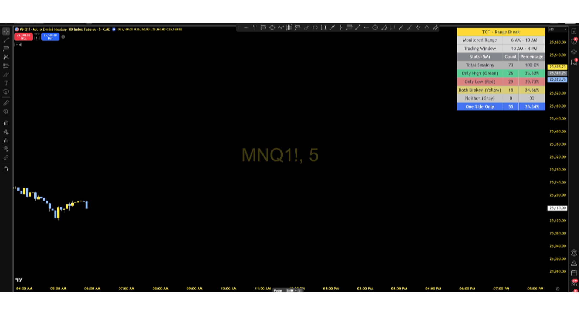 - βAutomated Range DetectionAutomatically captures the high and low of any user-defined time window. Default configuration tracks the 6:00 AM - 10:00 AM Eastern Time session, ideal for US equity futures.
